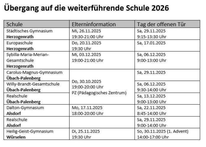Sie erhalten weitere Informationen per Post vom Schulverwaltungsamt der Stadt Herzogenrath. Von einzelnen Schulen liegen schriftliche Informationen/ Flyer vor, die wir am Infoabend und/ oder in der Beratungswoche auslegen bzw. Ihrem Kind danach mitgeben.