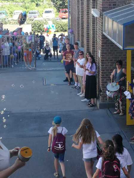 Am 25. und 26. Juni haben wir die Eulenklasse 4a und die Marienkäferklasse 4b verabschiedet. Bei den Eulen stand alles unter dem Motto "Mit Abstand die Besten", was auf den weißen T-Shirts und extra angefertigten Masken zu lesen war. Die coolen schwarzen T-Shirts der Marienkäfer waren mit "AK (Abschlussklasse) 2019-20" und allen Namen bedruckt. Morgens wurden die Kinder von der Eule und dem Marienkäfer in Form von großen Folienballons am geschmückten Schultor begrüßt. Nach der ersten halben Stunde in der Klasse, in der Erinnerungshefte und Unterschriften ausgetauscht wurden, ging es auf den oberen Schulhof. Dort wurden die Kinder von Frau Ehrt erwartet, die ihnen die Geschichte vom kleinen Glück vorlas und im Namen der Patenklassen 2a und 2b "Das kleine Glück" zusammen mit einer Postkarte des Patenkindes überreichte. Unsere Chorleiterin Gaby Bayer-Ortmanns verabschiedete sich mit einem Lied auf Abstand und einem kleinen Geschenk von den neun Chorkindern der beiden Klassen. Zu Beginn der Hofpause überraschte das OGS-Team alle OGS-Eulen und OGS-Marienkäfer mit einer Diashow und einem Abschiedsgeschenk. Nach der Pause ging es dann weiter mit dem Quiz zur Grundschulzeit. Frau Kirstein, Frau Winkler, Frau Müllenmeister, Frau Ehrt, Frau Klos, Frau Mandelartz und Frau Thöneböhn hatten leider nicht die geringste Chance gegen die 4a und die 4b, die beide mit dem überragenden Ergebnis von 10:0 gewannen. Nach der Übergabe von Abschiedsgeschenken - herzlichen Dank dafür :-) - wurde es Zeit für die Zeugnisse. Nach dem Lied "Wir sagen euch tschüss" wurden die Eulen- und Marienkäferkinder unter lautem Trommeln, Pfeifen, Rasseln und Applaus durch das große Tor aus der Schule gejagt. Hinter dem letzten Kind stiegen die Eule und ein Marienkäferballon in die Luft. Nun sind alle Eulen und Marienkäfer ausgeflogen. Wir wünschen Ihnen erholsame und schöne Sommerferien sowie einen guten Start an den weiterführenden Schulen!
