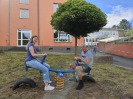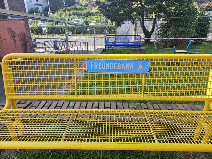 Mittlerweile erweitert die Wiese vor der Schule die Spielfläche während der Pause. Außer den Spielgeräten findet man dort auch zwei Bänke. Eine davon ist die "Freundebank". Zu ihr kann man gehen, wenn man niemanden zum Spielen findet. Vielleicht sitzt dort dann schon ein anderes Kind, das sich über Gesellschaft freut. :-)