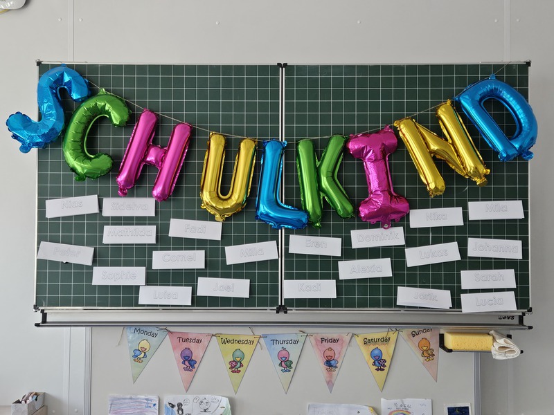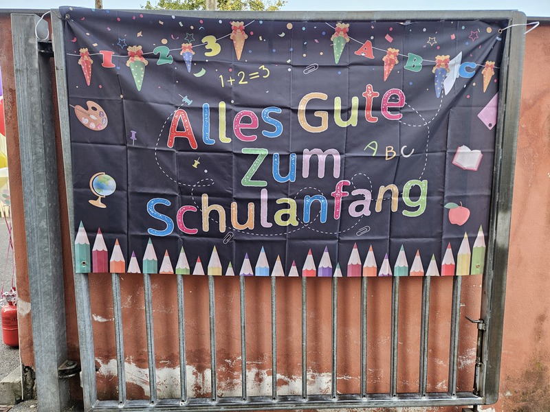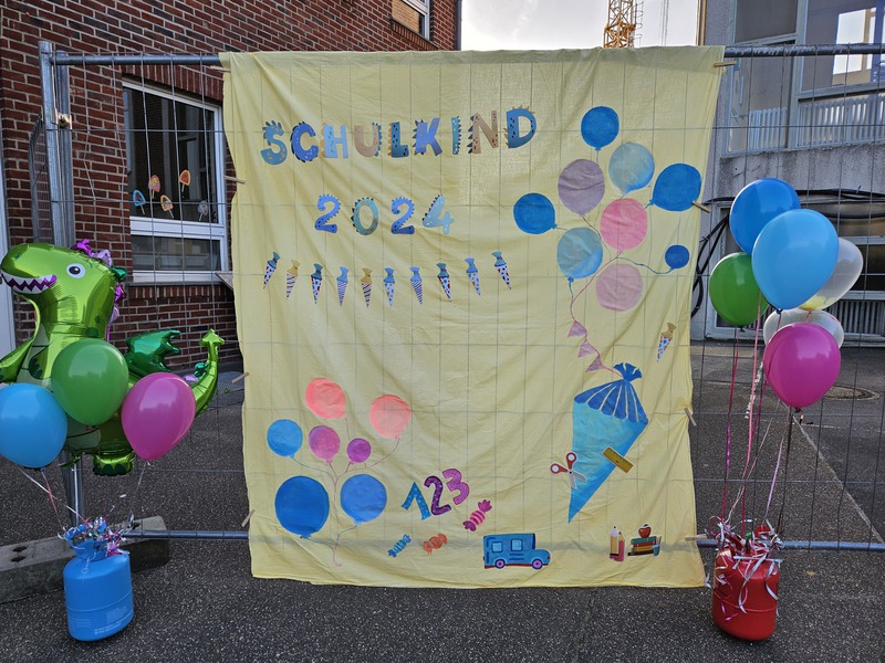 Am Donnerstag, den 22. August wurden unsere Eulen, Marienkäfer und Drachen eingeschult. Viele Familien kamen bereits um 9.00 Uhr in die Kirche St. Willibrord, wo Gemeindereferent Mario Hellebrandt sie - auch im Namen von Pfarrerin Fischer-Bausch und Pfarrer Intrau - in einem Schulgottesdienst mit dem Thema "Aufbruch in ein neues Land" auf den neuen Lebensabschnitt einstimmte. Um 10.00 Uhr trafen sich dann alle Schulneulinge und ihre Angehörigen auf dem unteren Schulhof. Dort begrüßte Schulleiterin Anika Ehrt die neuen Schülerinnen und Schüler. Auch die Patenklassen kamen persönlich vorbei. Die Kinder der Hundeklasse 3a kamen als Buchstabenkobolde, die Bären aus der 3c sangen und tanzten das Lied "Alle Kinder lernen lesen" und von den Kindern der Erdmännchenklasse 3b gab es noch ein kleines Einschulungsgeschenk. Dann ging es mit den Klassenlehrerinnen Frau Schipke, Frau Zimmermann und Frau Nelis zur ersten Unterrichtsstunde in die Klassenräume. Alle anderen Gäste wurden vom OGS-Team, der Sozialpädagogin und der Schulsozialarbeiterin mit Kaffee, Wasser und Keksen versorgt. Dabei konnten auch Fragen geklärt und Gespräche geführt werden. Nach ihrer ersten Unterrichtsstunde wurden die Kinder von einem Elternteil in der Klasse abgeholt. Mit Zeit für Fotos ging die Einschulungsfeier in der Schule zu Ende.