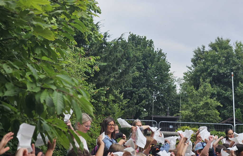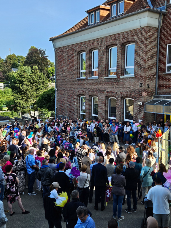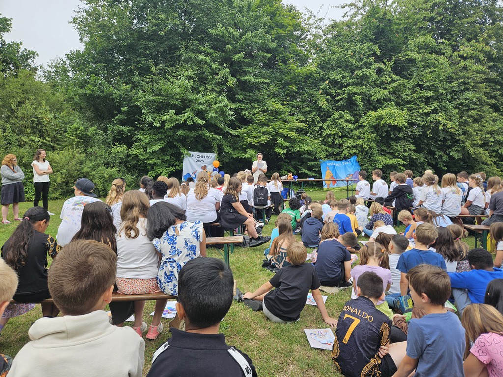 Dort las Frau Ehrt die Geschichte vom "großen Platsch" vor. Danach verteilten die Paten ihre Abschiedsgeschenke als Erinnerung an die schöne gemeinsame Zeit. Nun kamen die Eltern, Erziehungs- und Sorgeberechtigten dazu. Bei einem Quiz gegen Vertreterinnen der Klassenpflegschaften gewannen die Klassensprecherinnen und Klassensprecher souverän, wobei die Eltern sich ebenfalls toll geschlagen haben. Mit einem "Lächeln im Gesicht" sangen die Mäuse und Elefanten das Abschiedslied "Und wenn wir gehn". Die Zeugnisse wurden überreicht und schon kamen die Eulen, Marienkäfer, Drachen, Hunde, Ermännchen und Bären hinzu. Beim Tschüss-Lied und dem Winken mit Taschentüchern floss dann doch die eine oder andere Träne. Die ganze Schule bildete ein Spalier, um die Mäuse und Elefanten mit viel Getöse und zum Lied "Ferienzeit" vom Platz zu jagen.