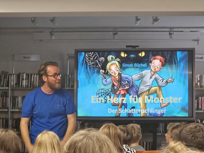 Am 18. September folgten unsere Viertklässler der Einladung von Frau Zimniak-Goeb in die Stadtbücherei. Dort fand für die Mäuse und Elefanten eine Autorenlesung von Simak Büchel statt. Der begeisterte die Kinder und ihre Lehrkräfte mit seiner lebendigen Lesung von "Ein Herz für Monster - Der Schattenschlinger". Dabei durften die Kinder auch selbst überlegen, wie sie sich den Bürgermeister und seine Frau vorstellen. Das zeigen die Bilder. Wir sagen DANKE für einen tollen Schulvormittag in der Stadtbücherei!