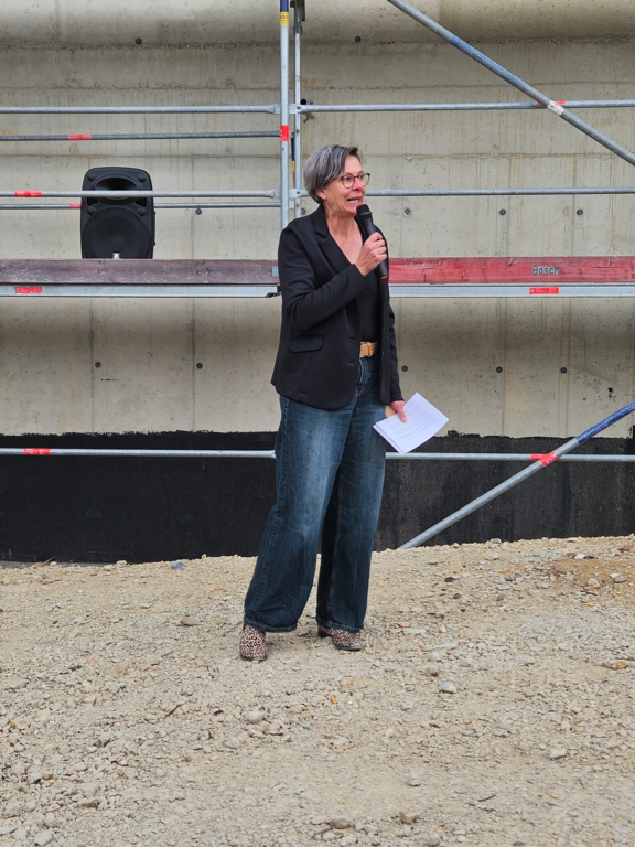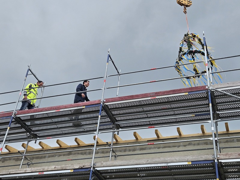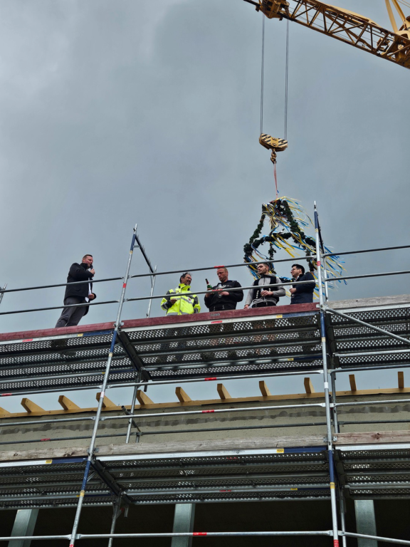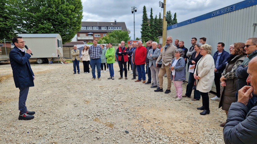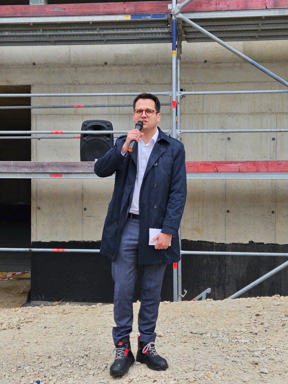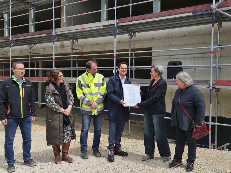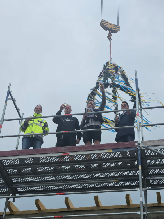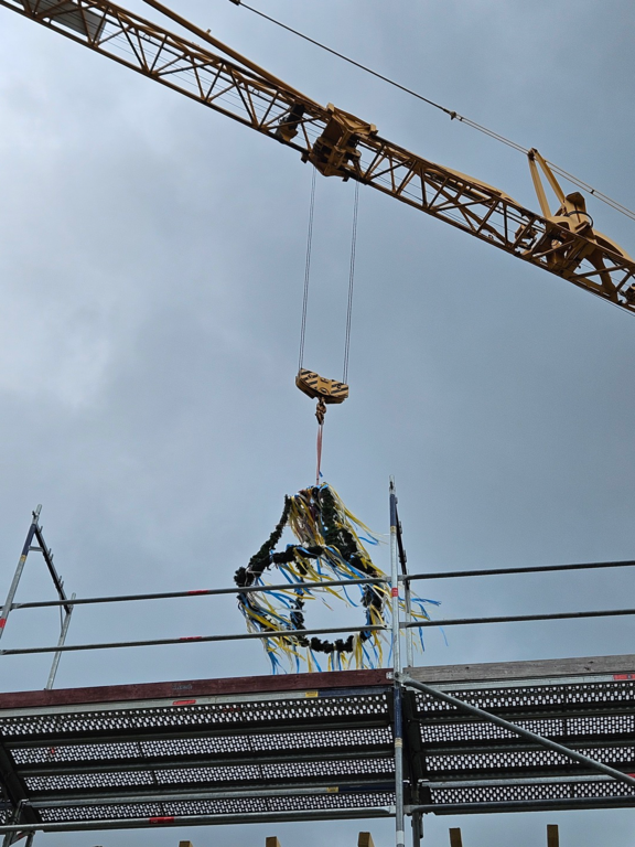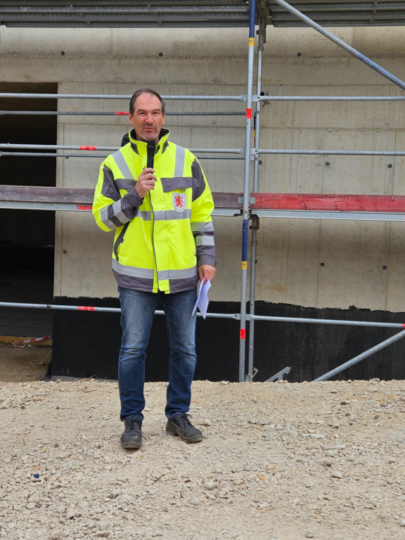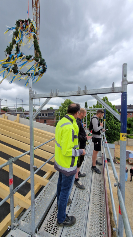 15 Monate nach dem ersten Spatenstich im Februar 2024 wurde Richtfest gefeiert. Wieder waren neben Bürgermeister Dr. Benjamin Fadavian viele Gäste aus Verwaltungsvorstand, Verwaltung, Politik sowie dem ausführenden Architekturbüro, der Baufirma, der Zimmerei und der Schulkonferenz gekommen. Nach dem offiziellen Teil mit Reden vom Bürgermeister, dem Technischen Beigeordneten Franz-Josef Türck-Hövener, der Beigeordneten für Soziales, Bildung und Familie Renate Wallraff und der Schulleiterin Anika Ehrt war es so weit: in luftiger Höhe wurde der Richtspruch durch den Zimmermann gesprochen. Danach überreichte der Bürgermeister Frau Ehrt noch die Urkunde, die im nächsten Jahr schon einen Platz im neuen Gebäude erhalten soll. Für die musikalische Gestaltung des Festes sorgten die Kinder unseres Schulchors unter Leitung von Gaby Bayer-Ortmanns. Zur Feier des Tages gab es in der neuen "Mensa" Getränke und Häppchen. Auch für alle Schulkinder gab es anlässlich des Richtfestes eine leckere Überraschung: So läuteten wir das folgende lange Wochenende mit Eis für alle ein!