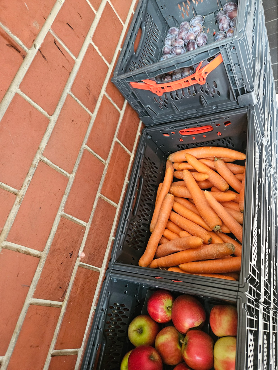 In diesem Schuljahr werden wir wöchentlich mit jeweils zwei Kisten pro Klasse voller Snackgemüse und -obst beliefert. Gestern kamen die ersten Pflaumen, Möhren und Äpfel an, die in den Klassen mit viel Appetit verspeist wurden. Wir freuen uns über diese gesunden Fitmacher als Ergänzung zum Schulfrühstück!
